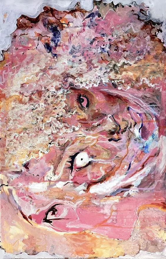 Once I had a love and it was divine! I first fell in love with a dream of who I was. I was gazing into the tunnel of another dimension: all my selves were a swirling confluence of spirit and flesh. I am everyone I’ve ever been and still much more; I can tell you who I am, but never how long she’ll stay. Perhaps perfecting mercuriality will be my greatest feat. acrylic, oil pastel, watercolor, charcoal, on paper on wood panel 22" x 18" 2024